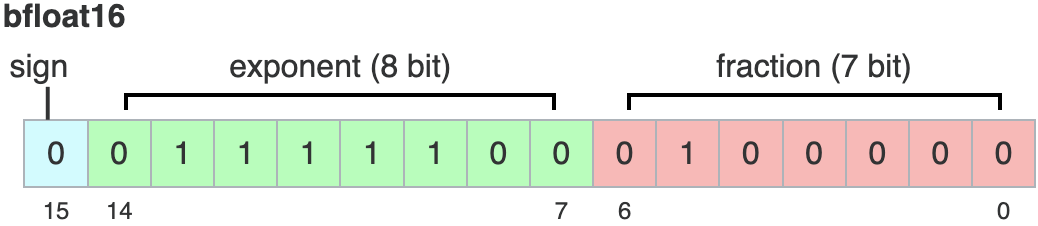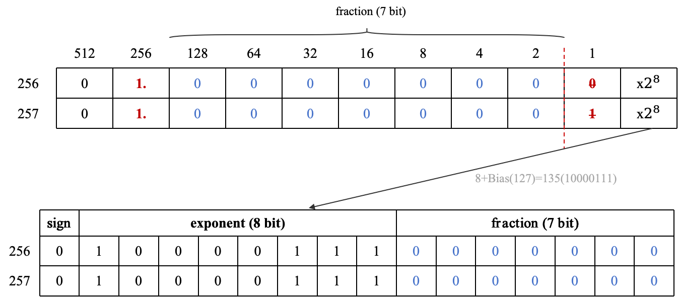 第二个 256 的预期数据应当是 257。当我们按照下图给定的 bf16 的格式对 256 和 257 两个数据进行类型转换后发现,因为尾数限制导致 257 实际能存储到的值和 256 是一致的,这就是为什么本该存储 257 数据的位置依然是 256。