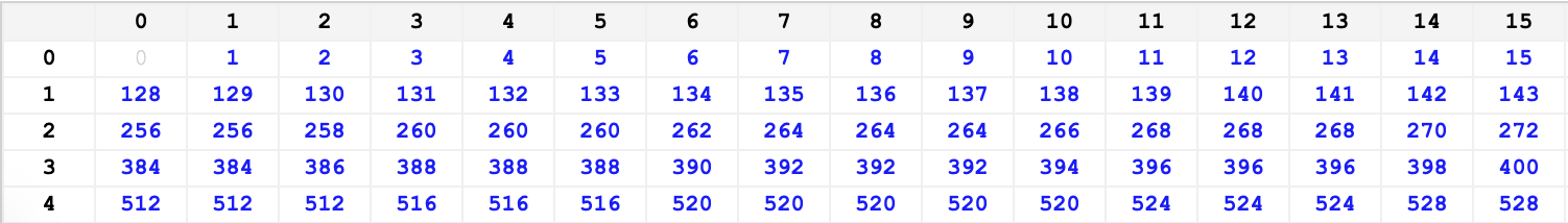 下面是在 $i * 128 + j$ 规则下,(i, j) 同 1D Index 之间的对应关系。其中最早开始出现重复的数据是 256,下面我们分析重复出现的原因。